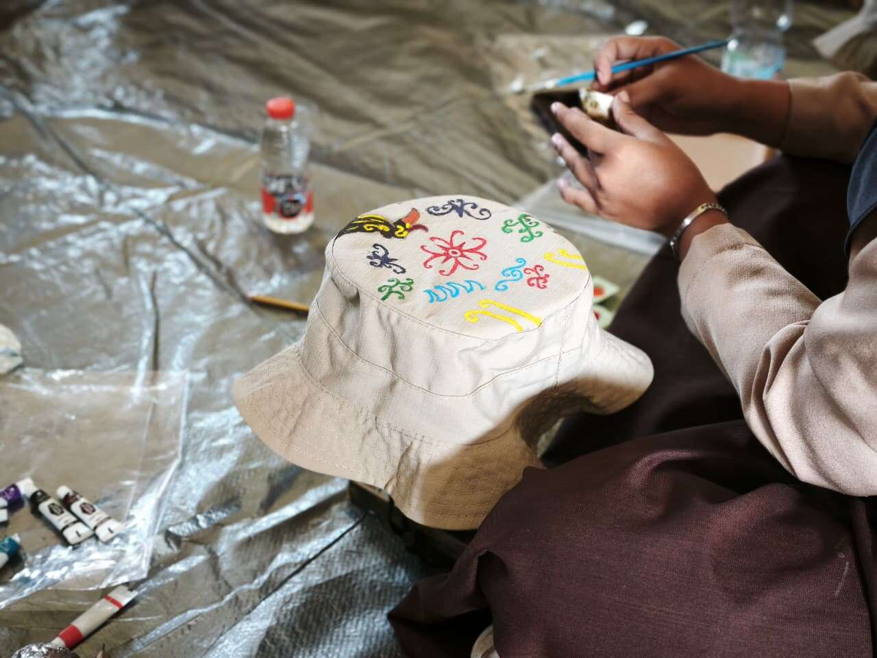 Suasana kegiatan tampak hidup ketika para siswa mulai mengikuti sesi praktik. Salah satu kegiatan yang paling menarik perhatian adalah melukis motif budaya pada bucket hat dan media kreatif lainnya. Siswa terlihat serius dan menikmati proses menciptakan karya masing-masing. Ragam warna dan pola khas Kalimantan menjadi ciri kuat pada hasil karya mereka.